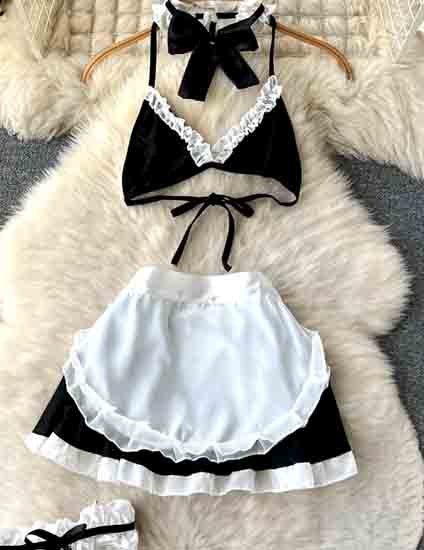 مجموعة الملابس التنكرية المثيرة مع سليب داخلي جي-سترينغ و تنورة قصيرة، مجموعة لانجري الخادمة الشقية